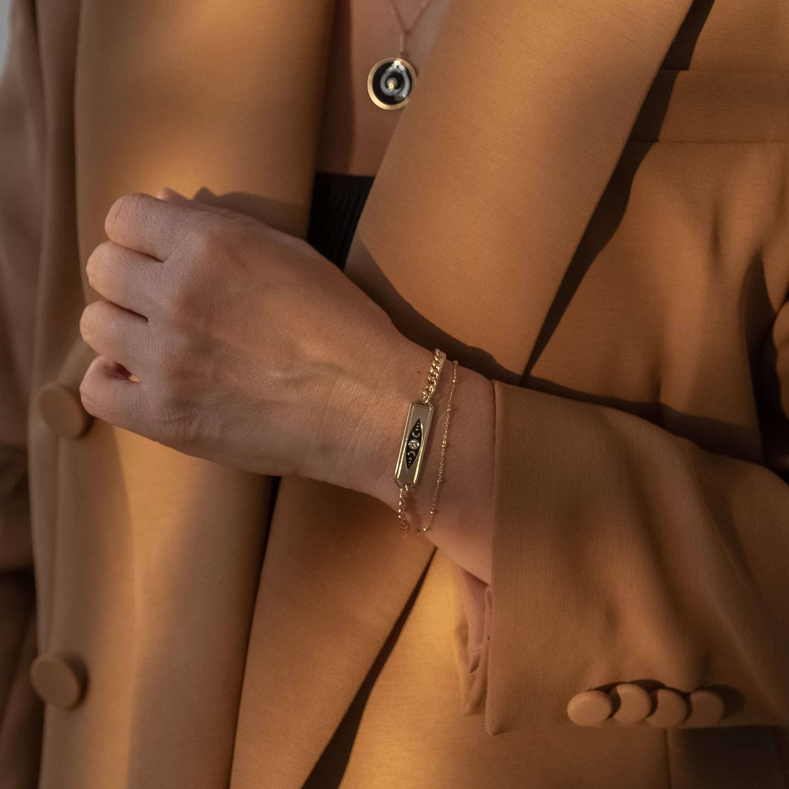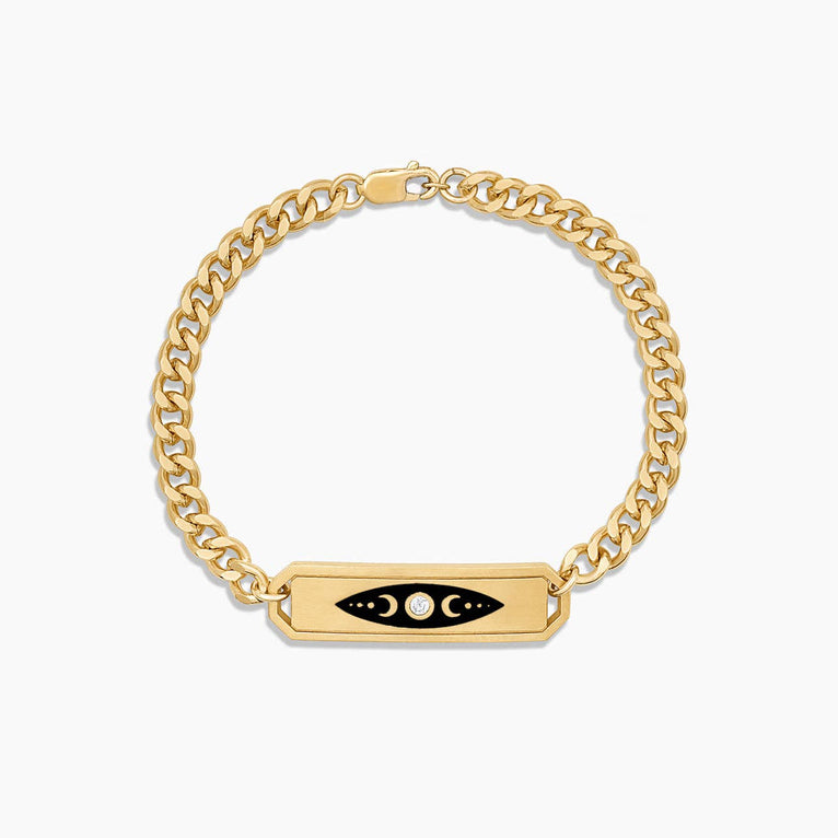 14k gold plated divine feminine id bracelet with black enamel and cubic zirconia on 4mm curb chain. Available in two lengths.