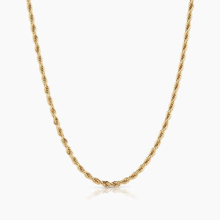 This 70's-inspired rope necklace is 14k gold plated 2.5mm slim rope 14 inch chain necklace. Take the vintage look all the way with an unbuttoned cotton shirt, or modernize it with clean lines and textures.